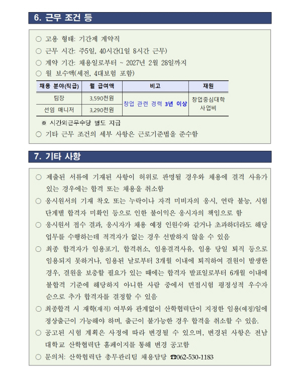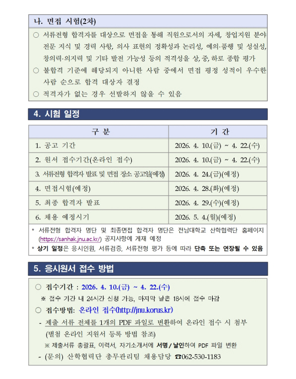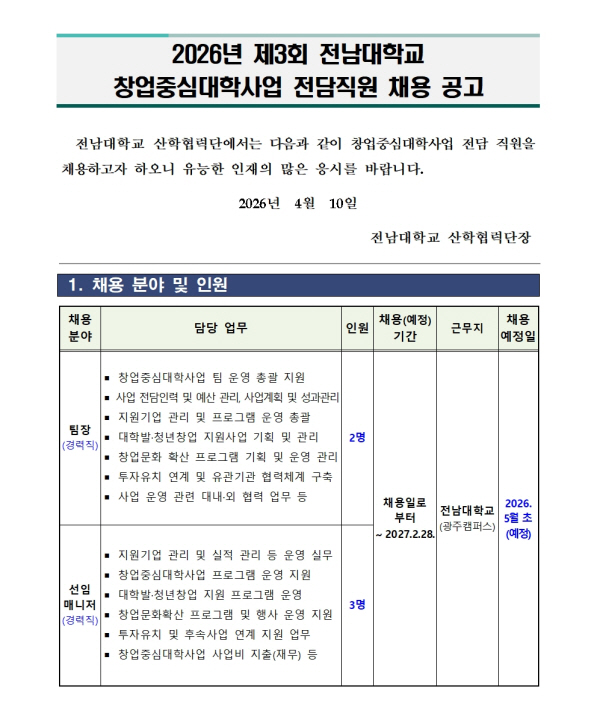 fnctId=bbs,fnctNo=1151 글번호 1006758 2026년 제3회 전남대학교 창업중심대학사업 전담직원 채용 공고 작성일 2026.04.10 수정일 2026.04.10 작성자 산학협력단 조회수 837 첨부파일 1. 2026년 제3회 전남대학교 창업중심대학사업 전담직원 채용 공고.hwp 미리보기 2. 제출 서류 서식.hwp 미리보기 3. 온라인 지원서 등록 방법.pdf 미리보기